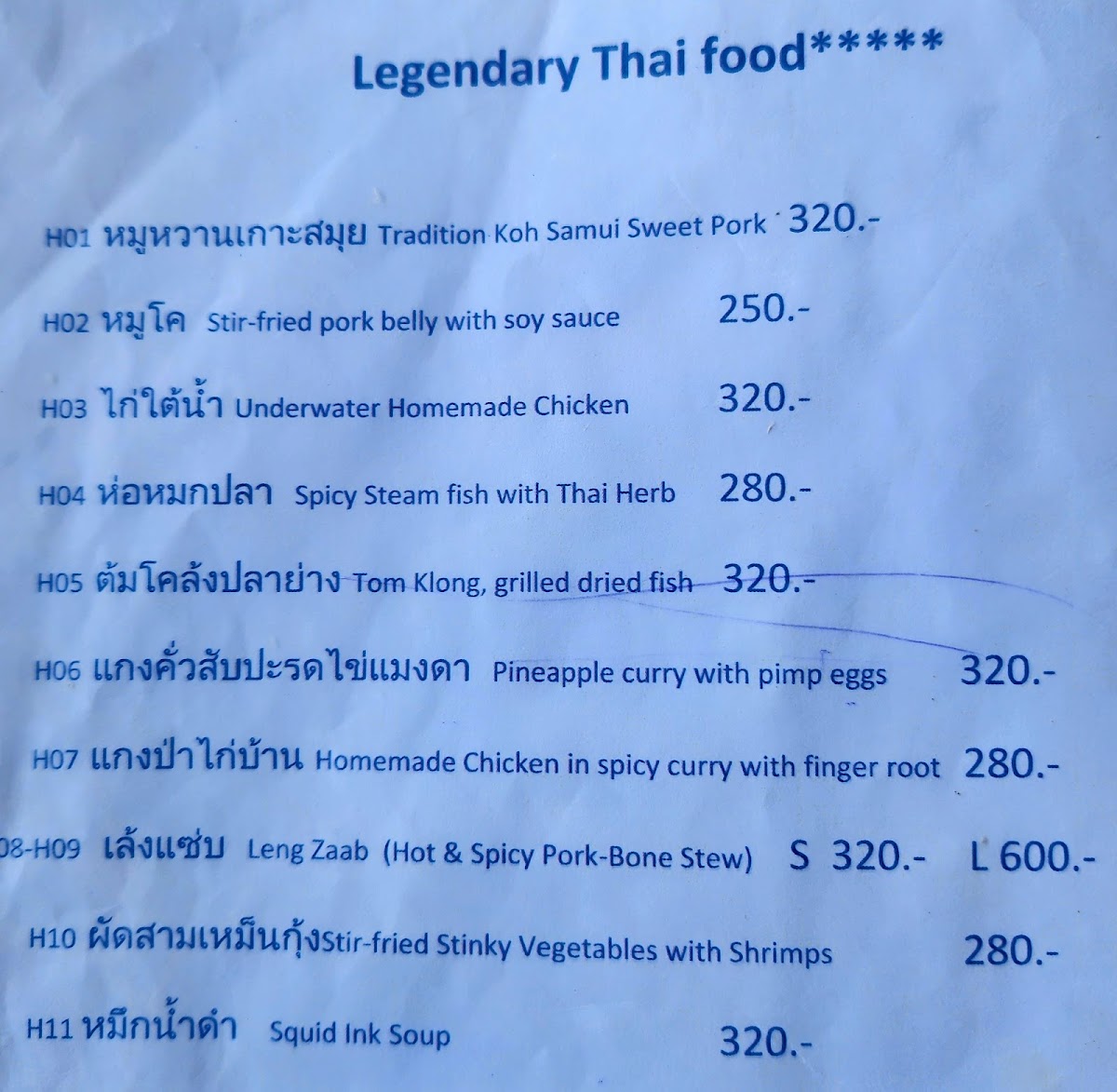 Highland Paradise Koh Samui Menu